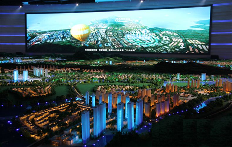 首先將城市的所有(建筑、交通、環境)制作成三維動畫內容;其次用制作好的沙盤模型展示城市的風貌,然后利用投影機將三維動畫內容投射到屏幕上,大屏幕在播放的同時,實體沙盤模型也會同步配合展示,呈現出震撼的視覺效果。