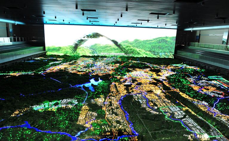 在空間、信息和觸控三屏的聯(lián)動下的沙盤。由空間屏的三維場景,準(zhǔn)確的把現(xiàn)實世界里的所有展現(xiàn)出來,例如可以任意的查詢地理信息、任意的去調(diào)整角度進行瀏覽、根據(jù)需要來添加備注等。